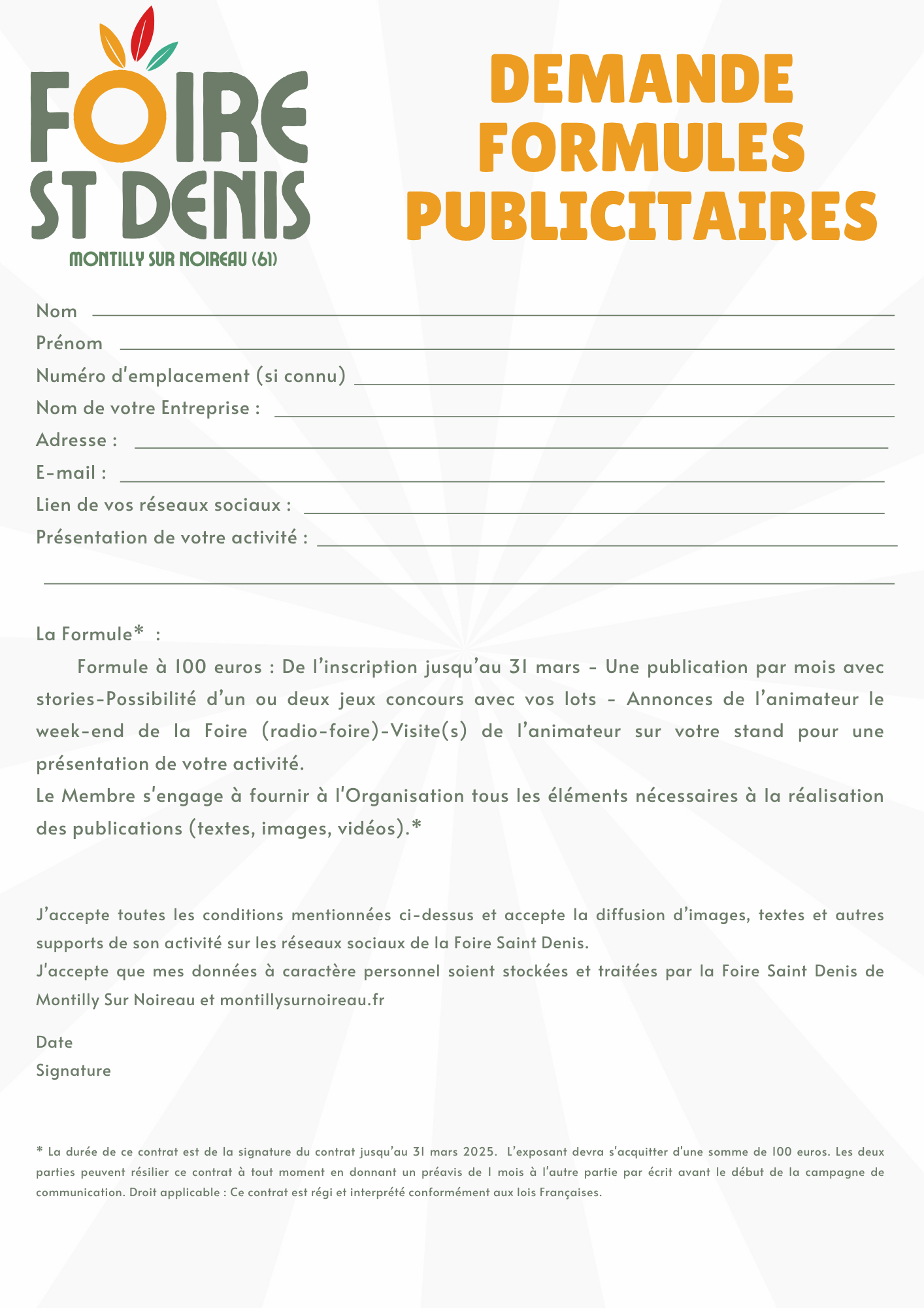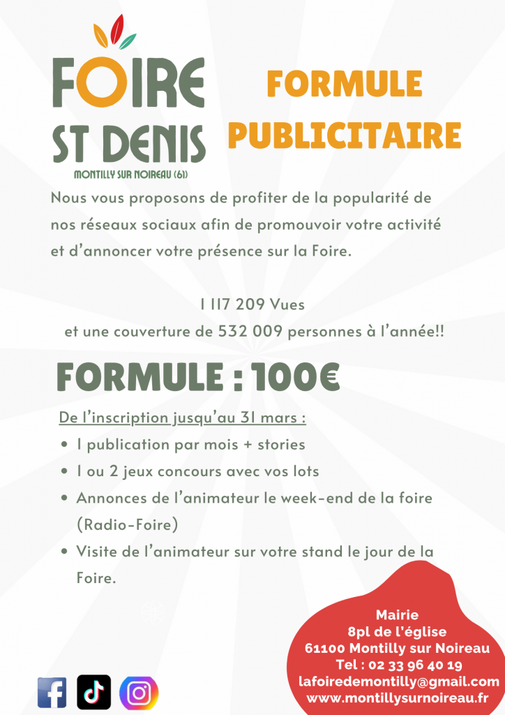 Contrat d'adhésion pour la formule de communication proposées sur les réseaux sociaux de la Foire Saint Denis de Montilly Sur Noireau Entre le Comité de la Foire Saint Denis de Montilly Sur Noireau (dénommé "l'Organisation" dans ce contrat) et l'Entreprise indiquée ci dessus (dénommée "le Membre" dans ce contrat). Objet : L'objet de ce contrat est de formaliser l'adhésion de la promotion de votre activité sur les réseaux sociaux de la Foire Saint Denis de Montilly Sur Noireau.